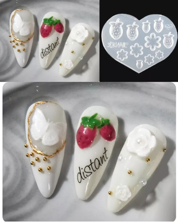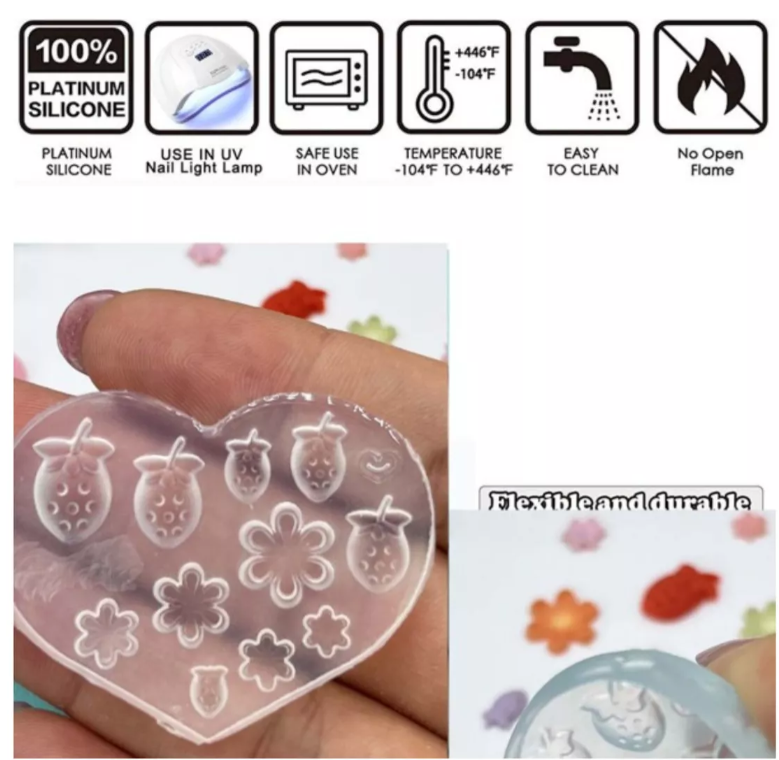 Este molde de silicona para uñas incluye dos diseños encantadores: mini fresas y mini flores. Con estos moldes, podrás crear decoraciones únicas y detalladas en tus uñas de forma sencilla y profesional. Su material de silicona flexible facilita la extracción de las figuras sin dañarlas. Perfecto para manicuras creativas y personalizadas. Atrévete a lucir unas uñas originales y llenas de estilo con este set de moldes de silicona.